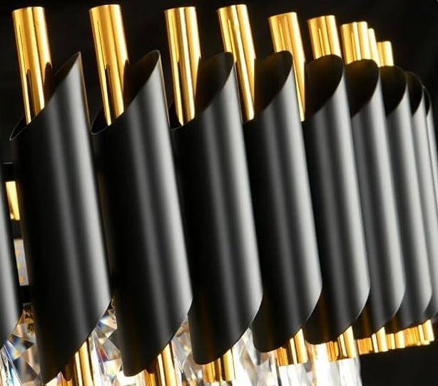 At the top, the fixture is encircled by a sleek black metal trim accented with gold-tone details, forming a bold contrast that highlights the sparkle of the crystals below. The combination of metallic finishes and faceted crystal elements gives the chandelier a rich, sophisticated presence.