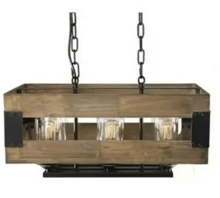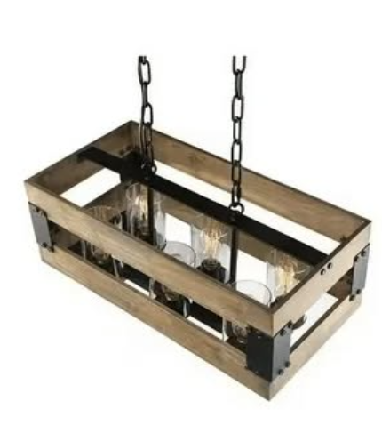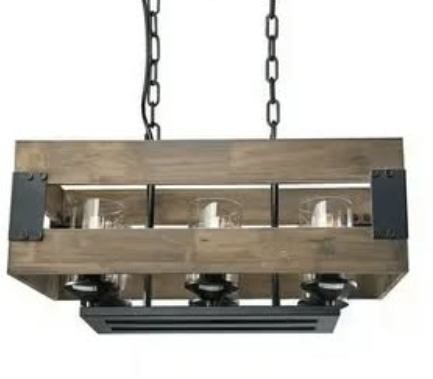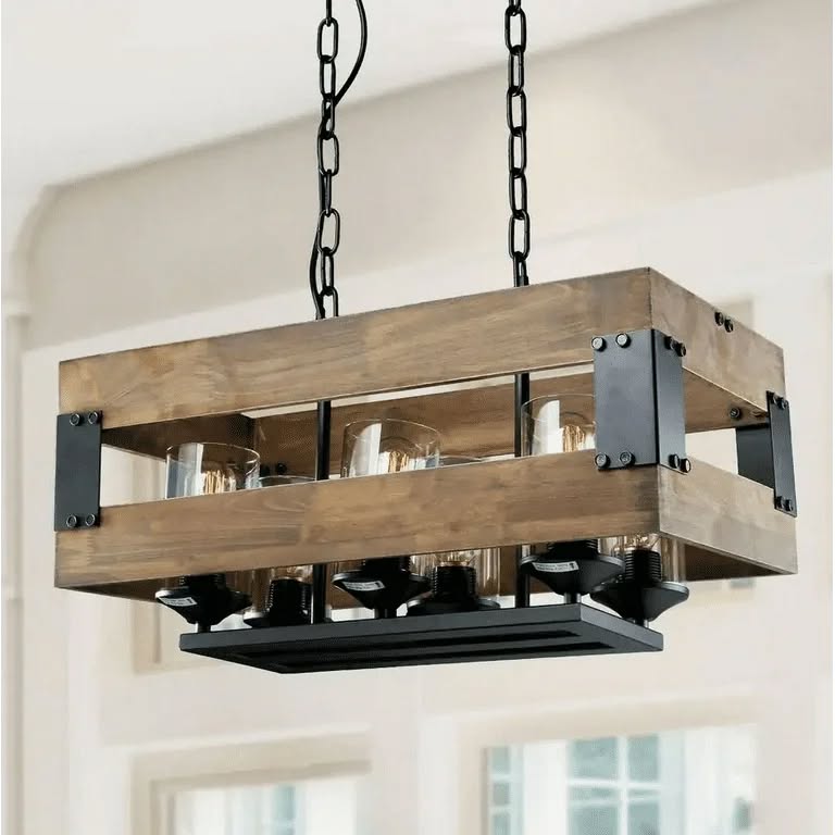 This chandelier is a rustic industrial-style pendant light featuring a rectangular wooden frame suspended from the ceiling by black metal chains. Inside the open wooden structure, there are six individual light sockets, each enclosed in a clear cylindrical glass shade. The combination of natural wood, matte black metal, and exposed-style bulbs creates a warm yet bold aesthetic that blends rustic farmhouse charm with modern industrial design.