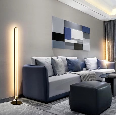 This modern floor lamp features a sleek, minimalist loop design that brings a contemporary touch to any room. Its slim, elongated LED light tube creates a smooth, continuous glow that gently washes the wall with ambient light. The open-loop metal frame adds an artistic element while keeping the lamp visually lightweight and elegant.