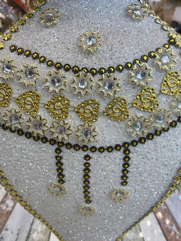 Hand-Decorated Details: Includes gold rhinestones, beaded patterns, and floral-inspired accents for added richness.