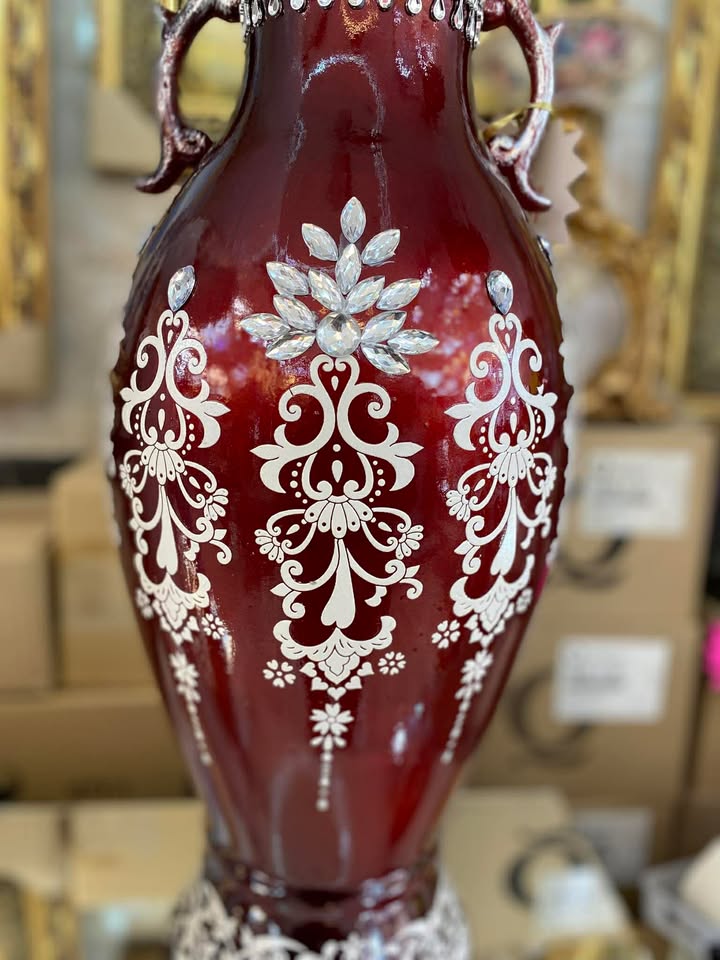 This elegant decorative vase showcases a rich deep burgundy finish that immediately adds a touch of luxury to any interior. Its tall, flared silhouette is designed with a gracefully curved rim and a slender neck that widens into a classic urn-shaped body. The vase is adorned with intricate white baroque-style patterns, meticulously applied to create a sophisticated contrast against the glossy dark background.